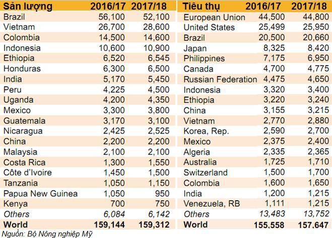 Dự báo năm 2017/18 thị trường arabica sẽ dư thừa nếu những nhận định rằng Brazil sẽ bội thu trở thành hiện thực. Tuy nhiên, thị trường robusta lại có thể rơi vào tình trạng thiếu cung do sản lượng sụt giảm ở Việt Nam – nước cung cấp robusta lớn nhất thế giới.